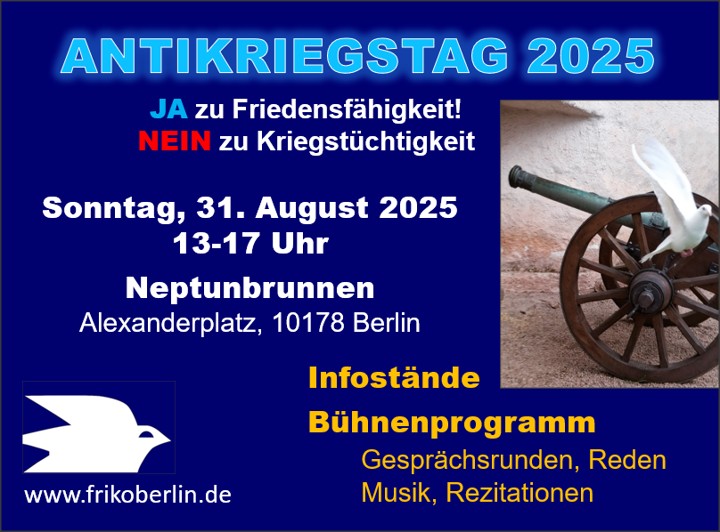 Heute in 2 Wochen ist Weltfriedenstag, auch bekannt als Antikriegstag. Wir wollen ihn schon am Sonntag, den 31.8. vor dem Roten Rathaus am Neptunbrunnen wie im letzten Jahr mit einem Friedensmarkt von 13-17 Uhr begehen.